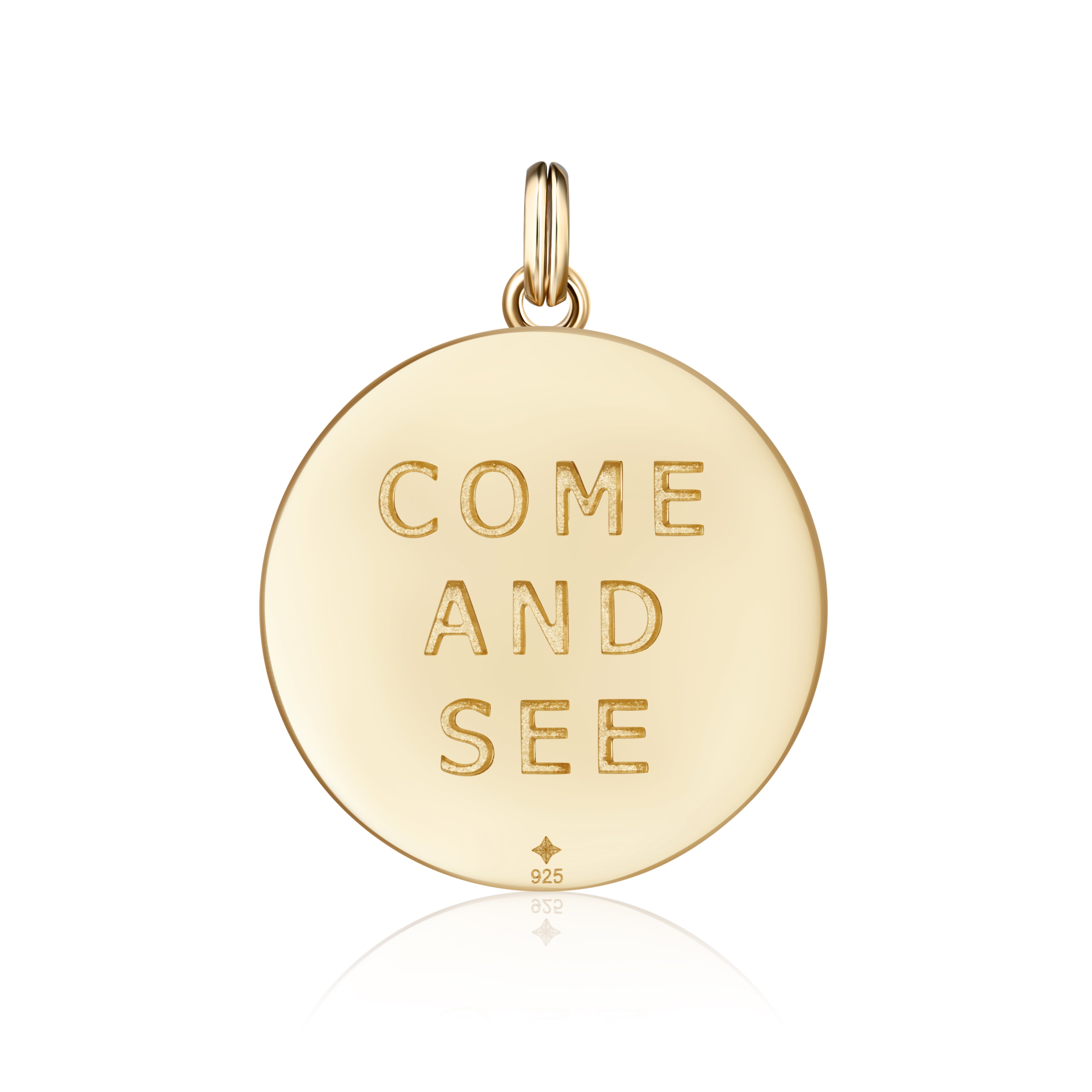 Suitable for men or women, the Nathanael pendant is a classic round medallion with a polished, stylized fig tree on a sandblasted background. The fig tree tells the mysterious story of Jesus “seeing” Nathanael- the sign Nathanael needed to declare Jesus the Son of God. The reverse of the pendant shows the lasered words “Come and see,” the words the apostle Philip spoke to Nathanael to invite him to come see Jesus.
